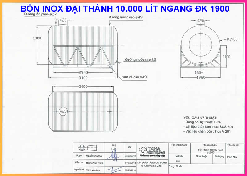 Chú Ý: M8ạ định là bồn 10m3 có đường kính 1700mm. Còm bồn đường kính 1900mm phải báo trước để báo giáo cụ thể.