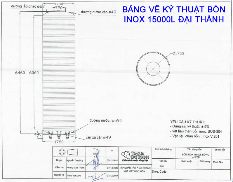 Kích thước bồn nước inox 15000l đứng Đại Thành.