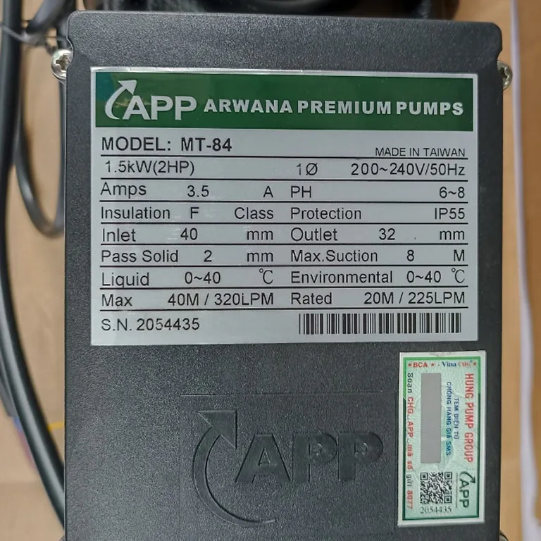 Thông số kỷ thuật máy bơm nước APP MT84