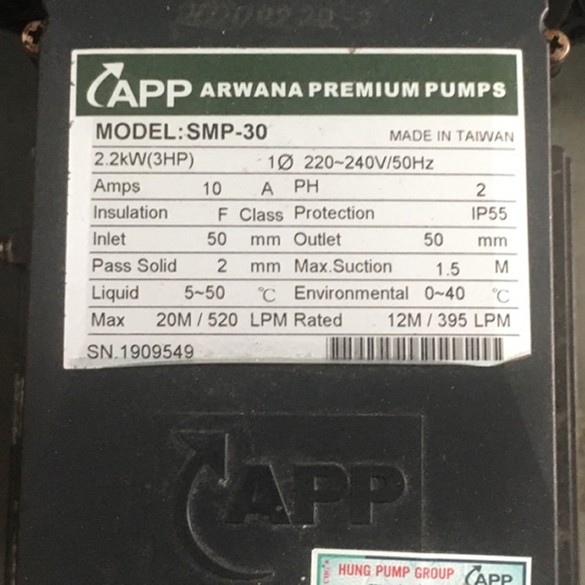Máy bơm APP SMP-30 (3Hp) 2.2Kw điện 220v (1 pha) là dòng bơm nước hồ bơi giá rẻ nhập khẩu từ Đài Loan