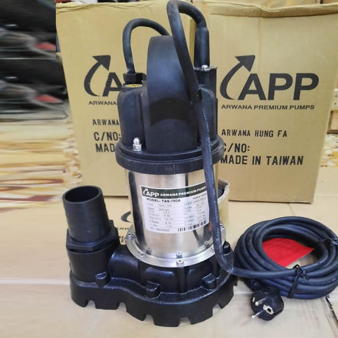 – Máy bơm nước thải 1Hp APP TAS 750A là dòng bơm thả chìm trong nước có phao