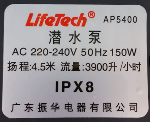 Thông số kỷ thuật máy bơm hồ cá Lifetech AP5400