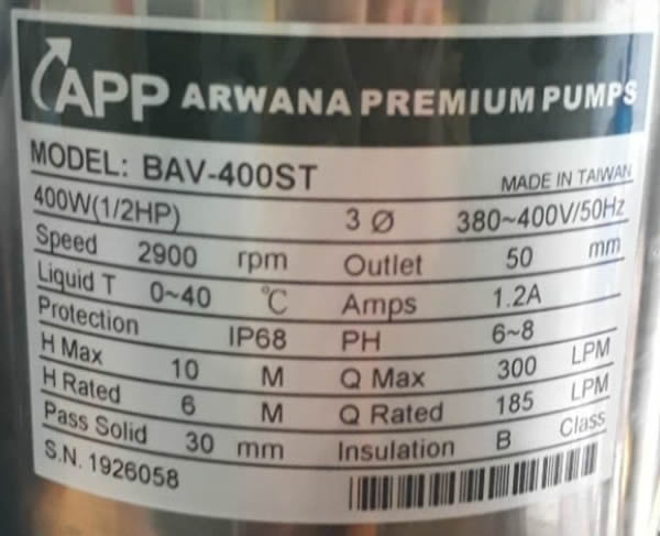 Thông số kỷ thuật máy bơm chìm BAV 400ST