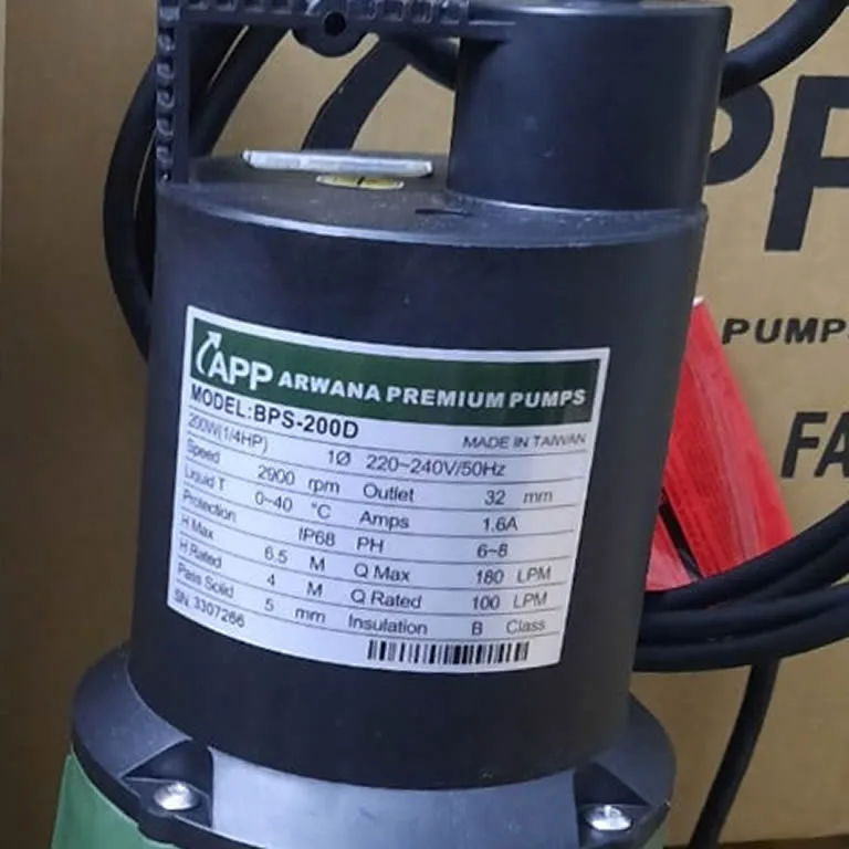 Máy bơm chìm APP BPS200D thuộc dòng máy bơm chìm hút nước thải thân nhựa, BPS 200D trang bị động cơ 1/3 HP và rãnh bơm sát đáy có khả năng hút nước cạn đến 3 mm. Với khả năng đẩy cao tối ưu 4 mét, BPS 200D thích hợp hút nước thải trong tầng hầm gia đình, bãi đậu xe, biệt thự với 9.3 m3/h