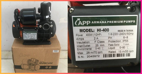 Máy bơm nước APP HI-400 HI400 HI 400 có công suất 400w 1/2Hp là loại bơm chuyên tăng áp lực nước nóng tự động siêu êm.