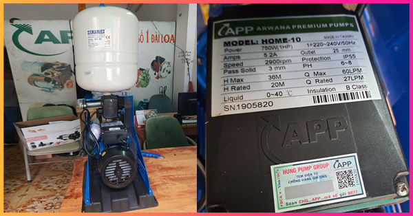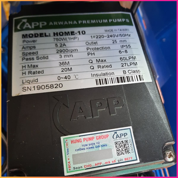 Máy bơm nước APP HOME-10 HOME10 HOME 10 có công suất 750w 1Hp là loại bơm chuyên tăng áp lực nước nóng tự động siêu êm.