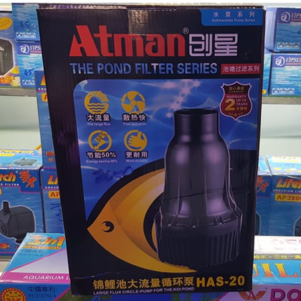 MÁY BƠM NƯỚC ATMAN HAS-20 HAS 20 là loại máy bơm cao cấp cho hồ cá Koi ATMAN với lưu lượng bơm lên tới 30000l/1h đây là loại máy bơm phù hợp với hầu hết tất cả các hồ cá Koi hiện nay.