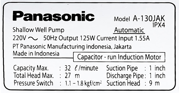 Thông số máy bơm áp lực Panasonic A 130JAK