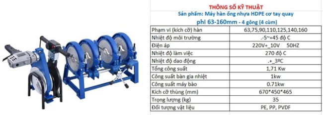 Thông số máy hàn bàn cơ quay tay 4 kẹp ống HDPF phi 70 90