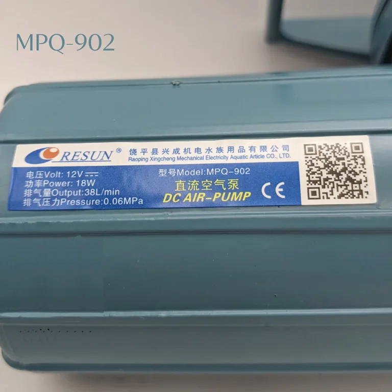 Máy thổi oxy Resun MPQ-902 DC 12v 18w là dòng bơm sục, sủi khí sử dụng điện bình ắc quy 1 chiều.